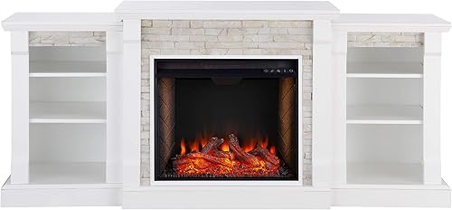 SEI Furniture Gallatin Faux Stone Alexa-Enabled Electric Bookcases Fireplace, White